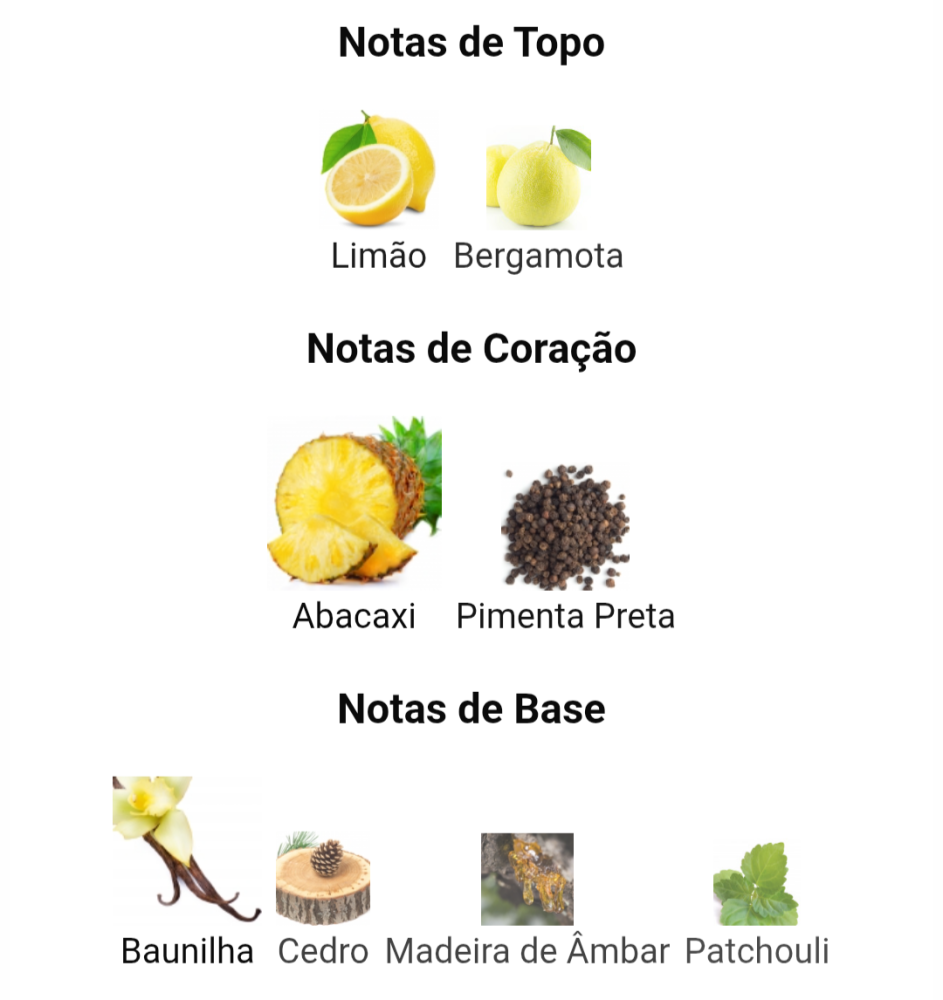 As notas de topo são: Limão e Bergamota. As notas de coração são: Abacaxi e Pimenta Preta. As notas de fundo são: Baunilha, Cedro, Madeira de Âmbar e Patchouli.