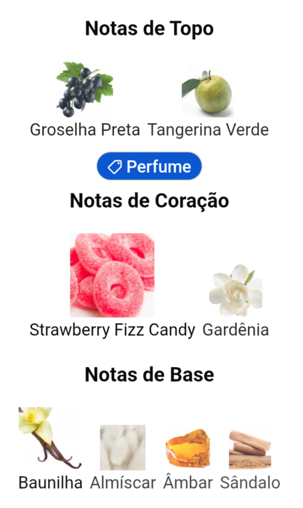 As notas de topo são: Groselha Preta e Tangerina Verde. As notas de coração são: Strawberry Fizz Candy e Gardênia. As notas de fundo são: Baunilha, Almíscar, Âmbar e Sândalo.