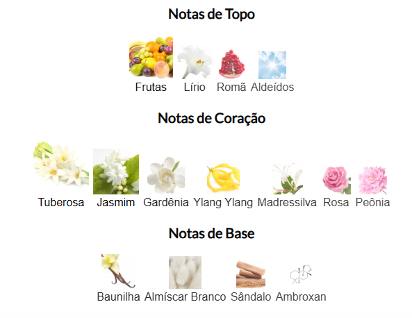 As notas de topo são: Frutas, Lírio, Romã e Aldeídos. As notas de coração são: Tuberosa, Jasmim, Gardênia, Madressilva, Ylang Ylang, Rosa e Peônia. As notas de fundo são: Baunilha, Almíscar Branco, Ambroxan e Sândalo.