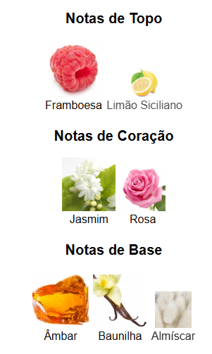 As notas de fundo são: Âmbar, Baunilha e Almíscar.