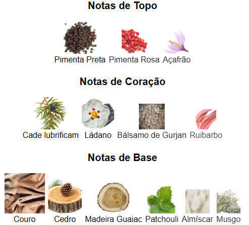 As notas de fundo são: Couro, Cedro, Madeira Guaiac, Patchouli, Almíscar e Musgo.