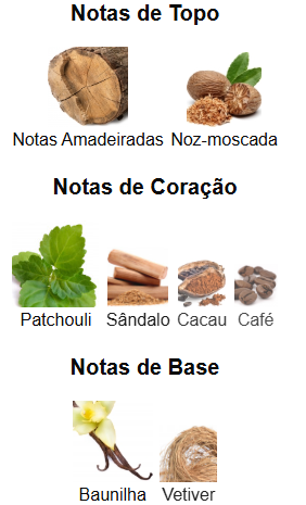 As notas de coração são: Patchouli, Sândalo, Cacau e Café.
