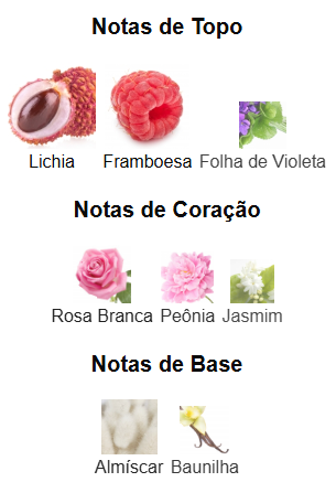 As notas de topo são: Lichia, Framboesa e Folha de Violeta.