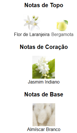 As notas de topo são: Flor de Laranjeira e Bergamota.