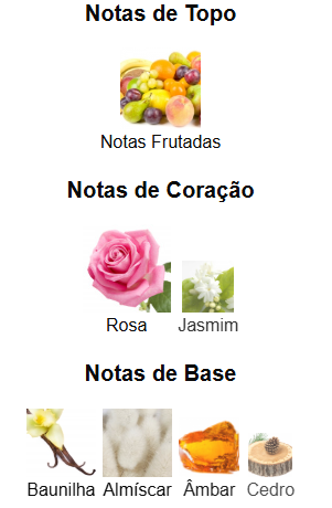 As notas de fundo são:Baunilha, Almíscar, Âmbar e Cedro.