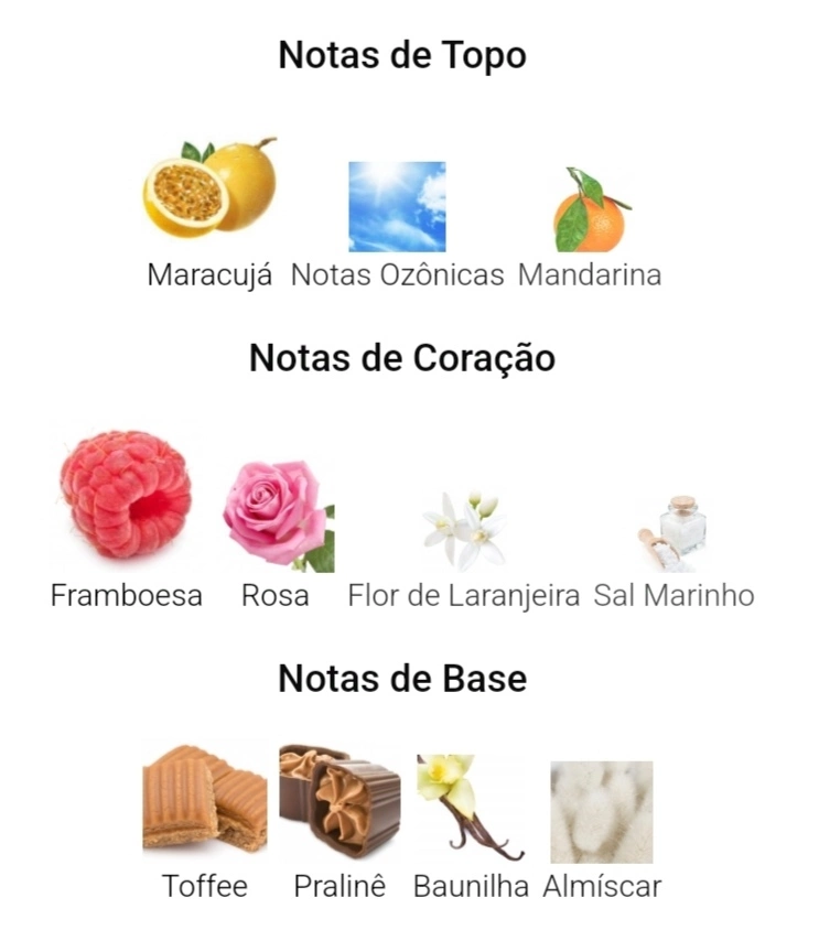As notas de fundo são: Toffee, Pralinê, Baunilha e Almíscar.