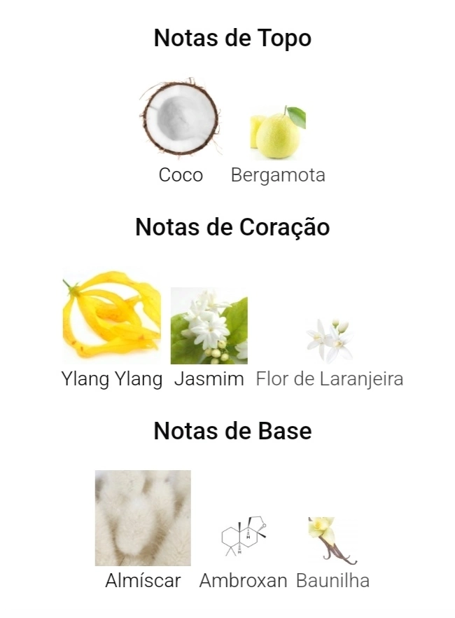 As notas de coração são: Ylang Ylang, Jasmim e Flor de Laranjeira.