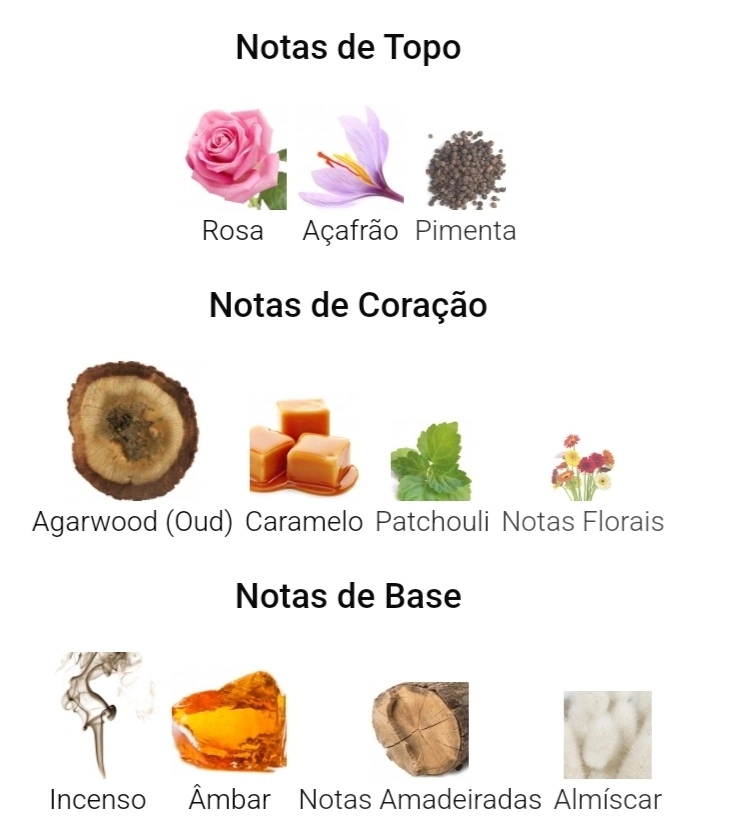 As notas de coração são: Agarwood (Oud), Caramelo, Patchouli e Notas Florais.