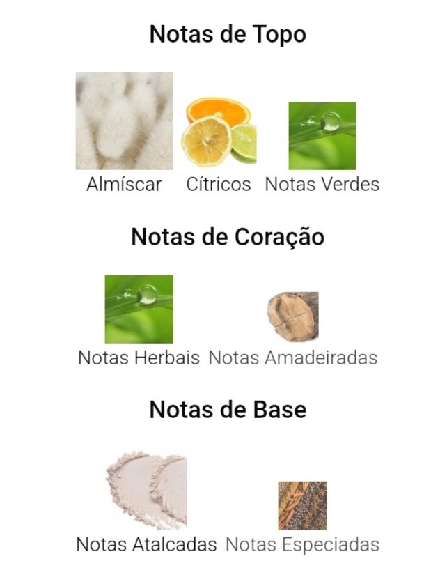 As notas de topo são: Almíscar, Cítricos e Notas Verdes.