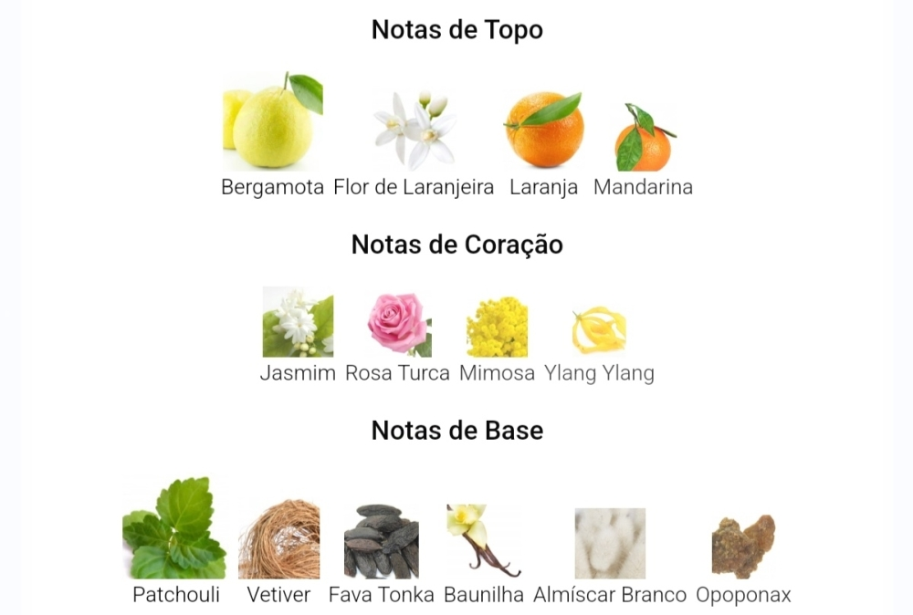 As notas de topo são: Bergamota, Flor de Laranjeira, Laranja e Mandarina.
