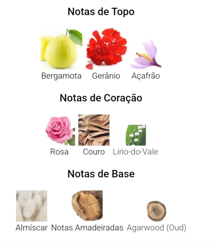 As notas de coração são: Rosa, Couro e Lírio-do-Vale.