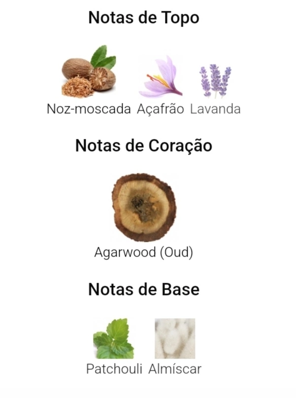 As notas de topo são: Noz-moscada, Açafrão e Lavanda.