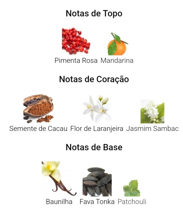 As notas de coração são: Semente de Cacau, Flor de Laranjeira e Jasmim Sambac.