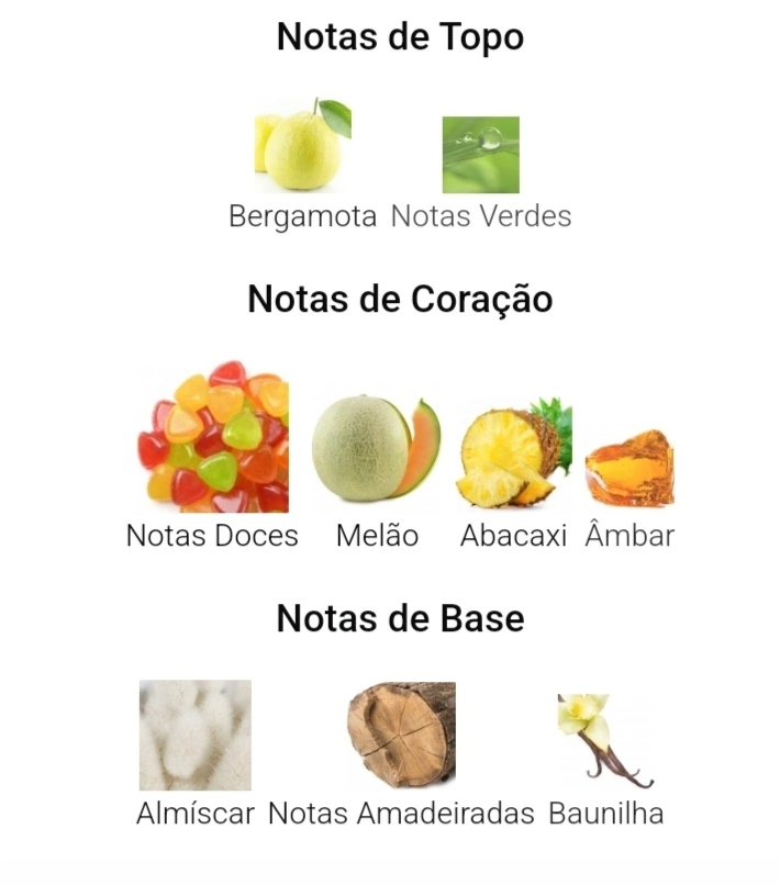 As notas de coração são: Notas Doces, Melão, Abacaxi e Âmbar.