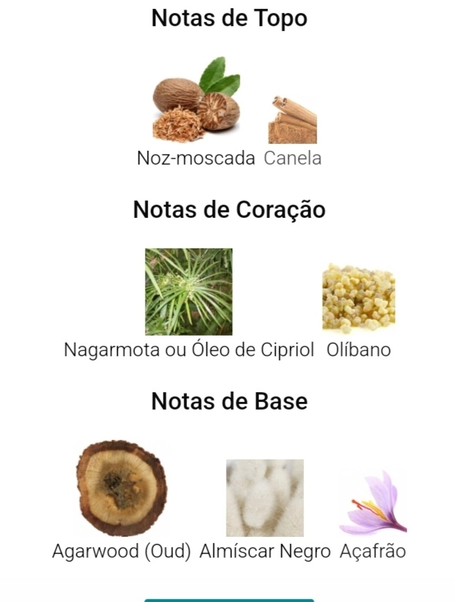 As notas de fundo são: Agarwood (Oud), Almíscar Negro e Açafrão.