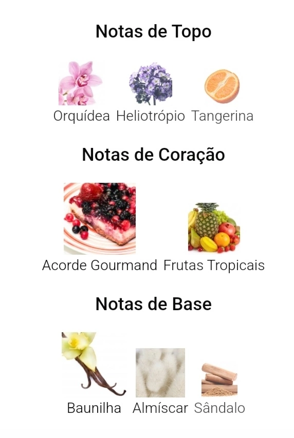 As notas de coração são: Acorde Gourmand e Frutas Tropicais.