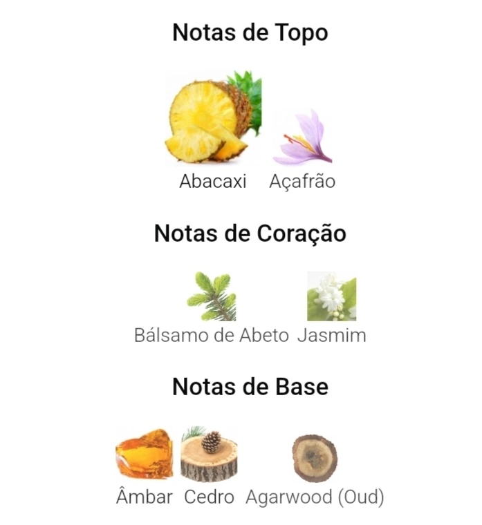 As notas de fundo são: Âmbar, Cedro e Agarwood (Oud).