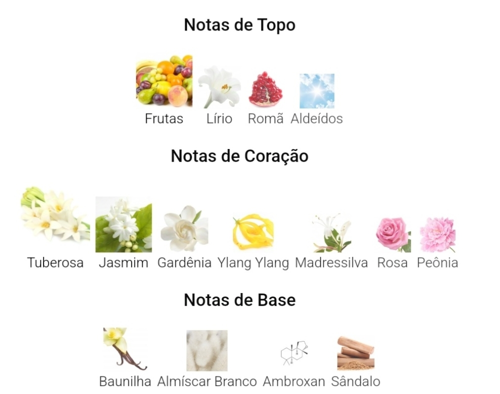 As notas de coração são: Tuberosa, Jasmim, Gardênia, Ylang Ylang, Madressilva, Rosa e Peônia.