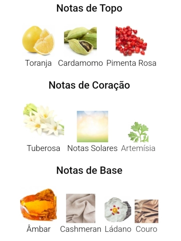 As notas de coração são: Tuberosa, Notas Solares e Artemísia.
