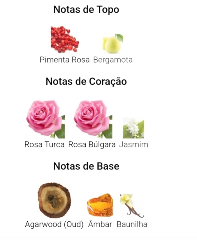 As notas de coração são: Rosa Turca, Rosa Búlgara e Jasmim.