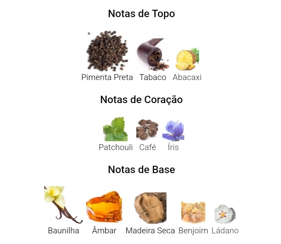 As notas de fundo são: Baunilha, Âmbar, Madeira Seca, Benjoim e Ládano.