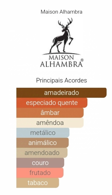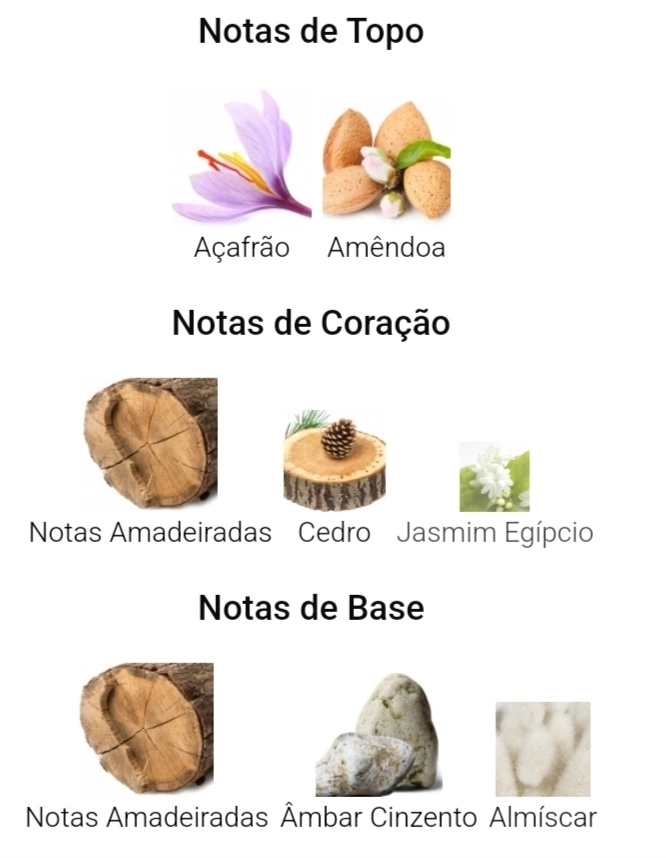 As notas de fundo são: Notas Amadeiradas, Âmbar Cinzento e Almíscar.