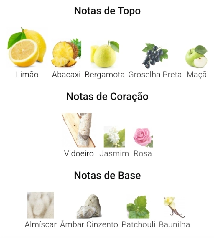 As notas de topo são: Limão, Abacaxi, Bergamota, Groselha Preta e Maçã.