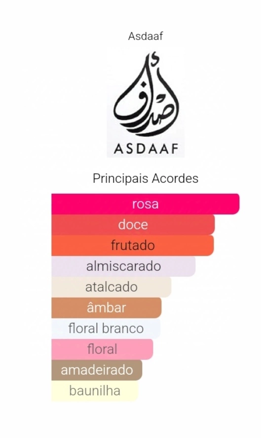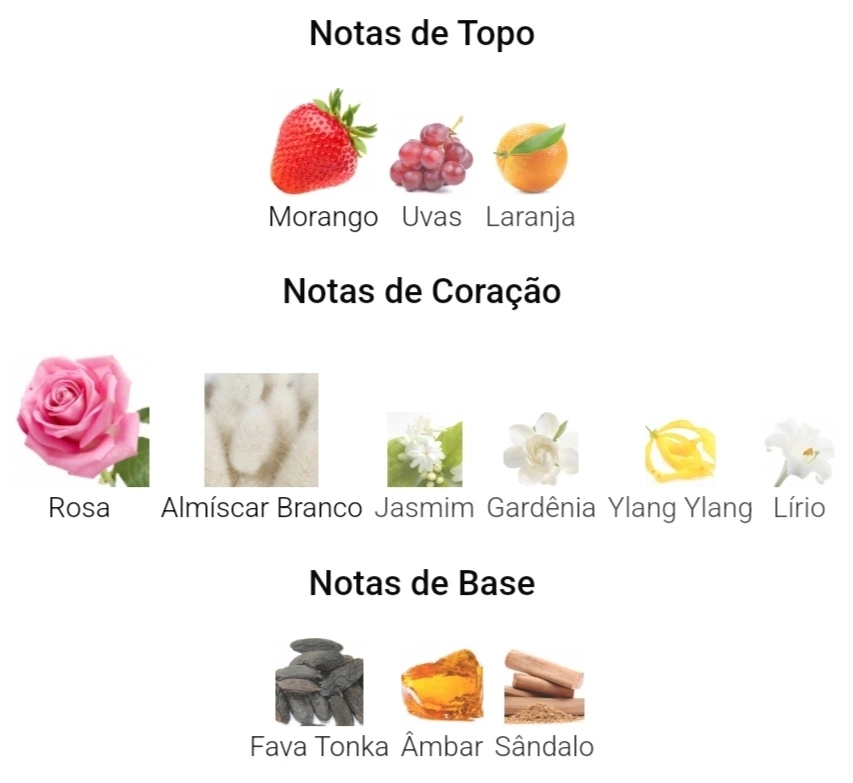As notas de coração são: Rosa, Almíscar Branco, Jasmim, Gardênia, Ylang Ylang e Lírio.