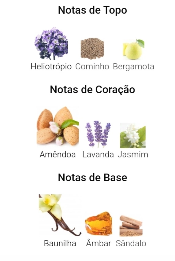 As notas de coração são: Amêndoa, Lavanda e Jasmim.