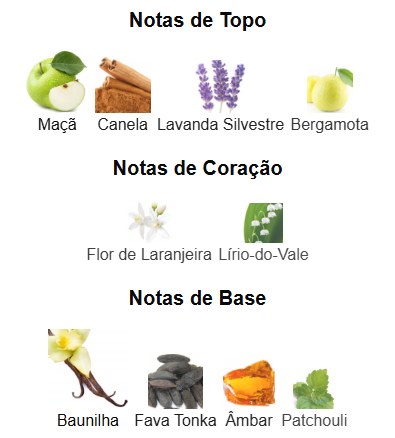 Topo: Abertura frutada com notas de maçã e pêra, combinadas com um toque refrescante de lavanda.