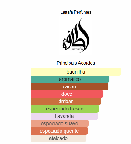As notas de topo são: Lavanda, Ameixa Mirabelle e Pimenta Rosa. As notas de coração são: Cacau, Noz-moscada e Davana. As notas de fundo são: Baunilha de Bourbon, Âmbar e Vetiver.