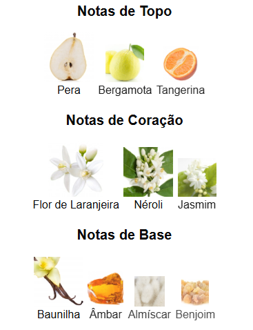 . As notas de coração são: Flor de Laranjeira, Néroli e Jasmim.
